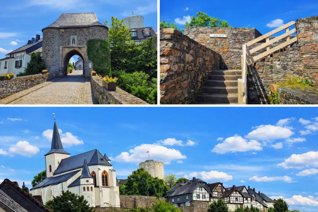 Mittelalterliche Höhenburganlage mit Ruinen, begehbarem Hauptturm und weitem Rundumblick über die Eifel. Umgeben von einer kleinen Burgsiedlung mit Fachwerkhäusern, Kirche und erhaltenen Stadttoren. Die Anlage kann ganzjährig frei besichtigt werden und eignet sich gut für einen kurzen Spaziergang.